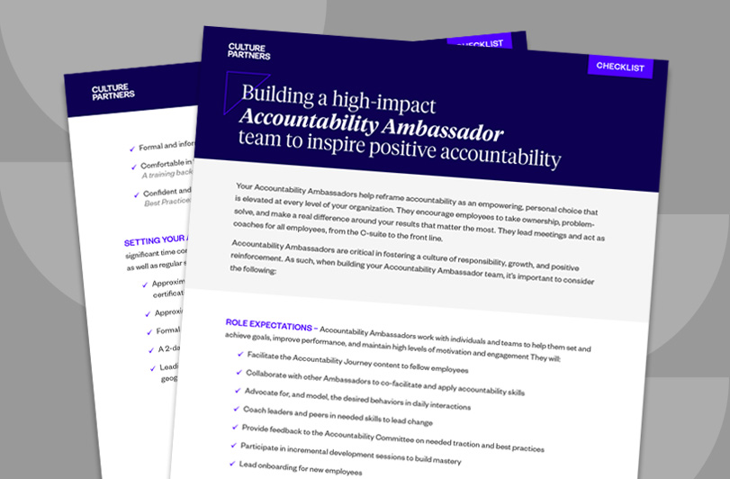 This checklist outlines the role of Accountability Ambassadors in reframing accountability as an empowering, personal choice that is elevated at every level of your organization. They encourage employees to take ownership, problem-solve, and make a real difference around your results that matter the most. Accountability Ambassadors are critical in fostering a culture of responsibility, growth, and positive reinforcement.