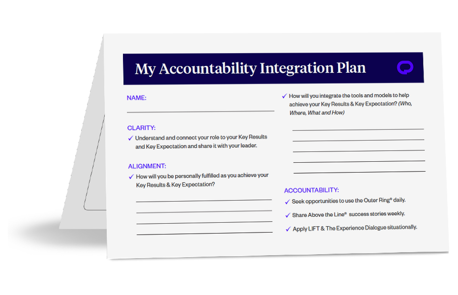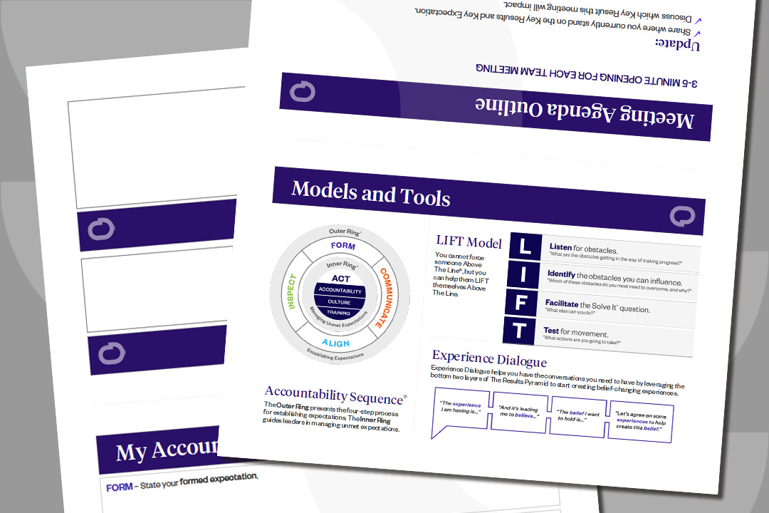 This practical tool is provided to participants after completing the Accountability for Leaders workshop. It is designed to help them immediately integrate key models, tools, and language of accountability into their daily practices.