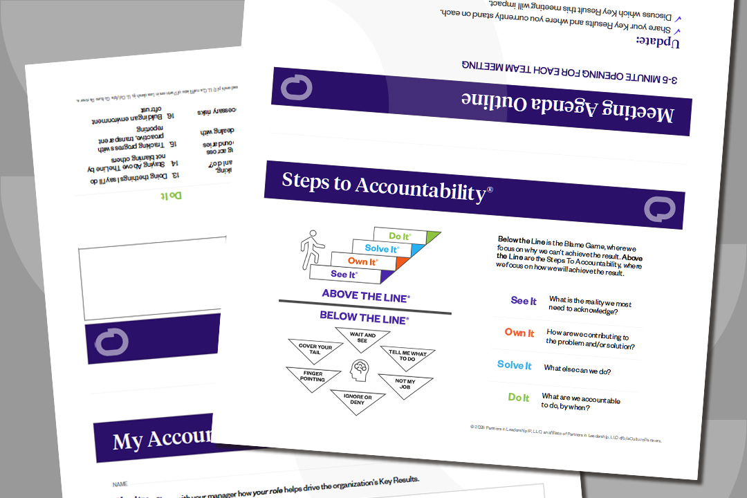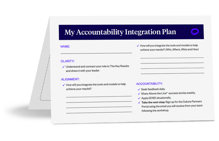 This practical tool is designed to help participants immediately apply the tools and mindsets introduced during the Accountability Workshop. It reinforces the core elements of the Steps To Accountability® model—See It, Own It, Solve It, Do It—and provides guidance for integrating these behaviors into everyday actions.