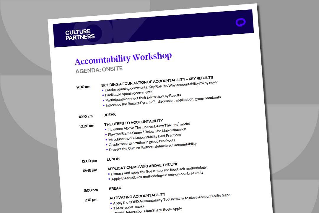 This document is the agenda for the Accountability Workshop, and provides the schedule, topics, and discussions for the day.