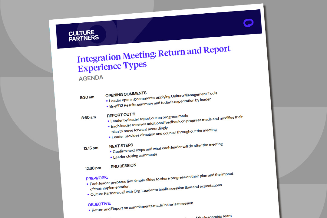 This document outlines the agenda for the Experience Types Return and Report Meeting. It covers the schedule, objectives, outcomes, and pre-work for this Integration Meeting.
