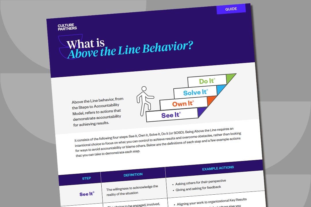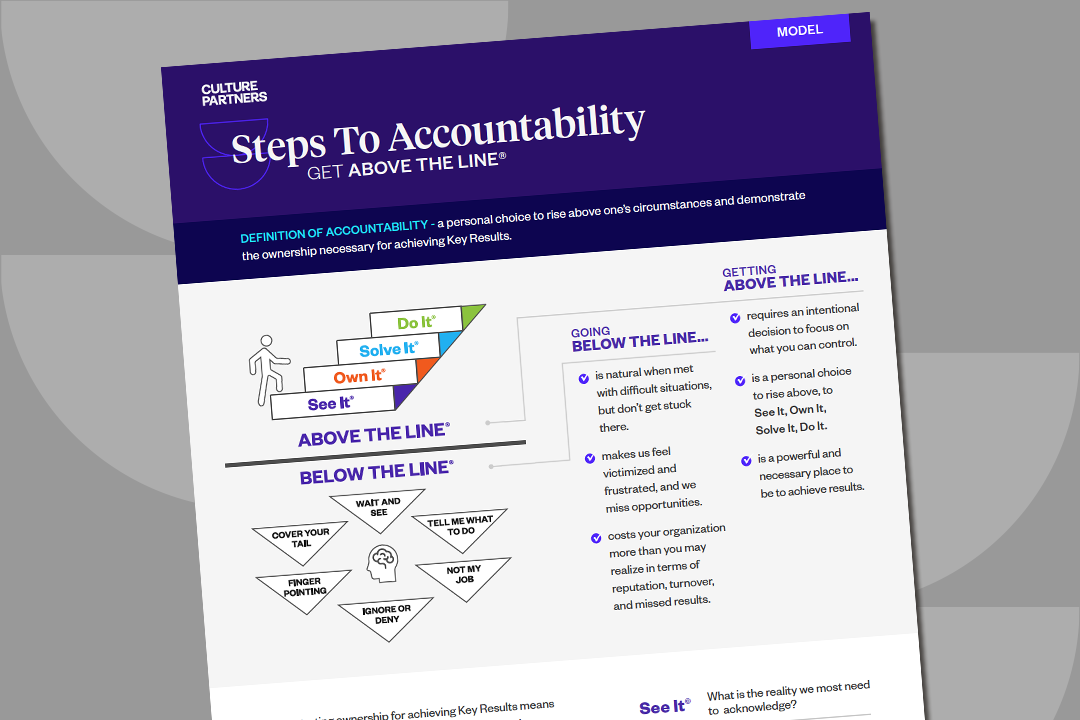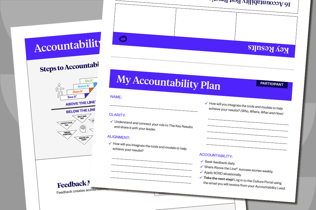 Take some time to study the Steps to Accountability® framework, focusing on the differences between being Above the Line® and being Below the Line®. Delve deeper into personal accountability and ownership using our SOSD® guide. Additionally, familiarize yourself with The Results Pyramid® to help understand the relationship between our beliefs and their effect on our actions to achieve results.