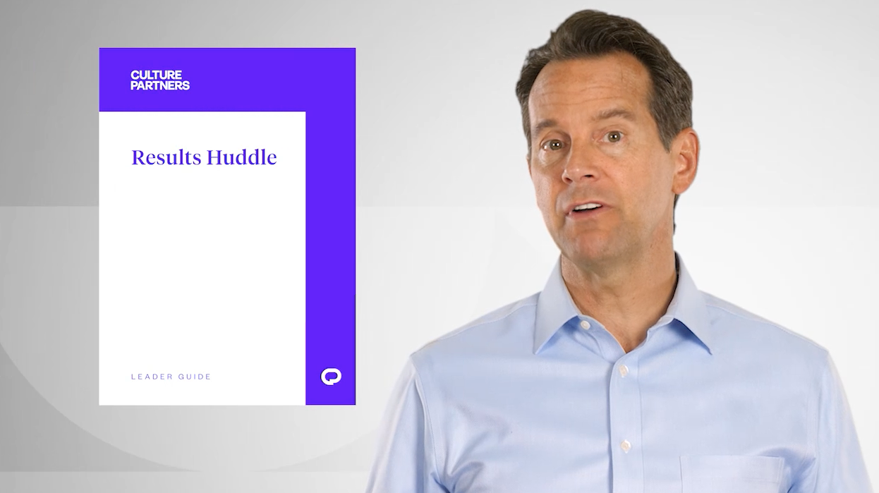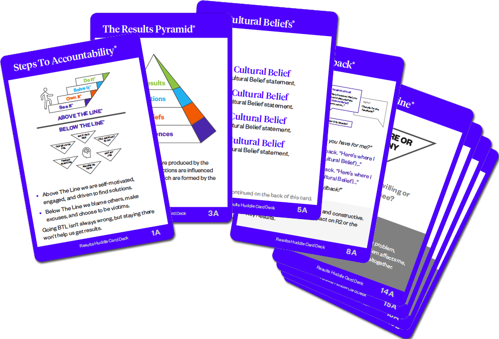 Leaders reserve the first 10 minutes of existing team meetings to walk through the Results Huddle Kit card’s activity that will review a previously covered Culture Partners’ tool or model. There are 24 different Results Huddle cards covering topics such as the Steps to Accountability®, the Results Pyramid®, working with your Cultural Beliefs®, and others. They begin with a review of take aways from the last Results Huddle, then a discussion based around a Culture Partners concept, and then an activity for your team to apply what they have learned about that concept.