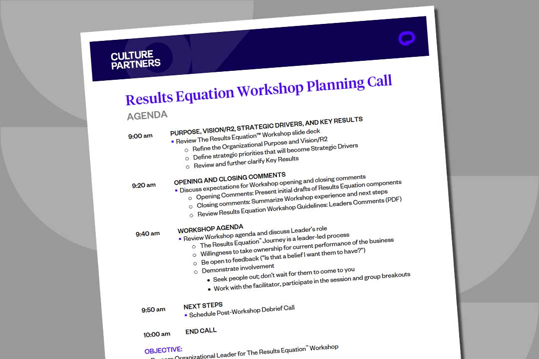 This document outlines the agenda for the planning call that precedes The Results Equation™ Workshop from The Results Equation Journey. This document covers the schedule, objectives, and outcomes of the planning call.