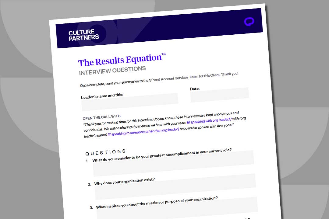 This document outlines interview questions for senior leaders in preparation for The Results Equation™ Workshop. It covers the leader’s understanding of the goals and strategy of the organization, and digs into their thoughts and opinions on key challenges and obstacles to growth.