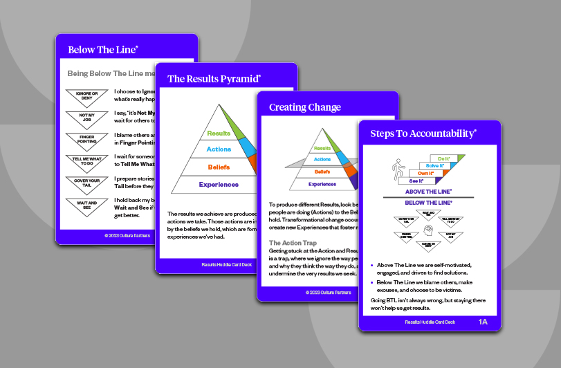 This document contains all of the Results Huddle Cards to facilitate Results Huddles at the first ten minutes of team meetings. You will use these after the Culture Equation Workshop to help reinforce key Culture and Accountability lessons.