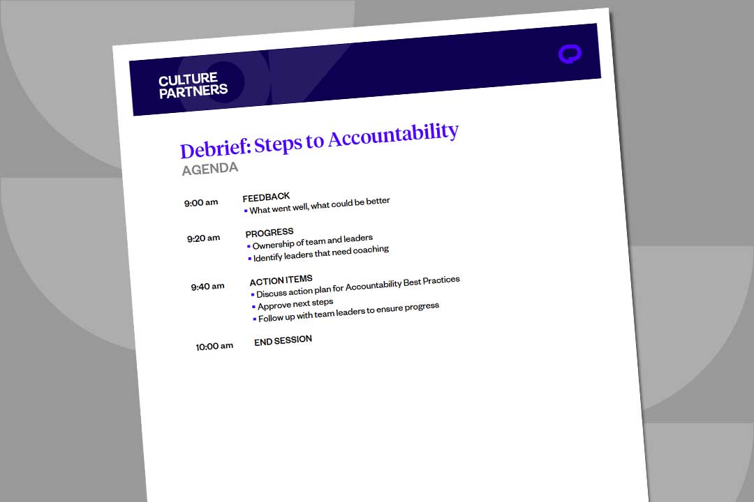 This is the agenda for the debrief call that follows the Steps to Accountability® Application Meeting. This document provides an opportunity to discuss feedback from the meeting, and review next steps to ensure progress.